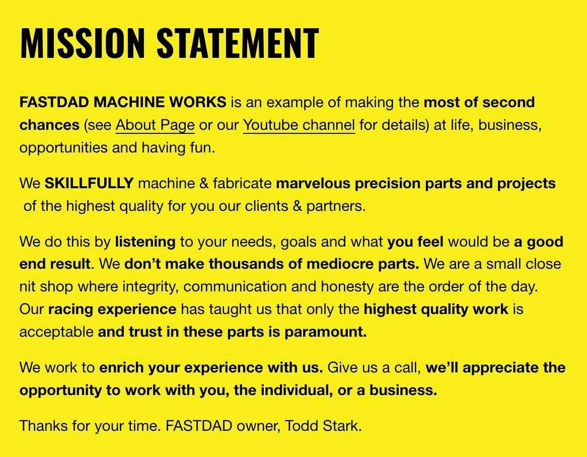 FASTDAD MACHINE WORKS is an example of making the most of second chances (see About Page or our Youtube channel for details) at life, business, opportunities and having fun.